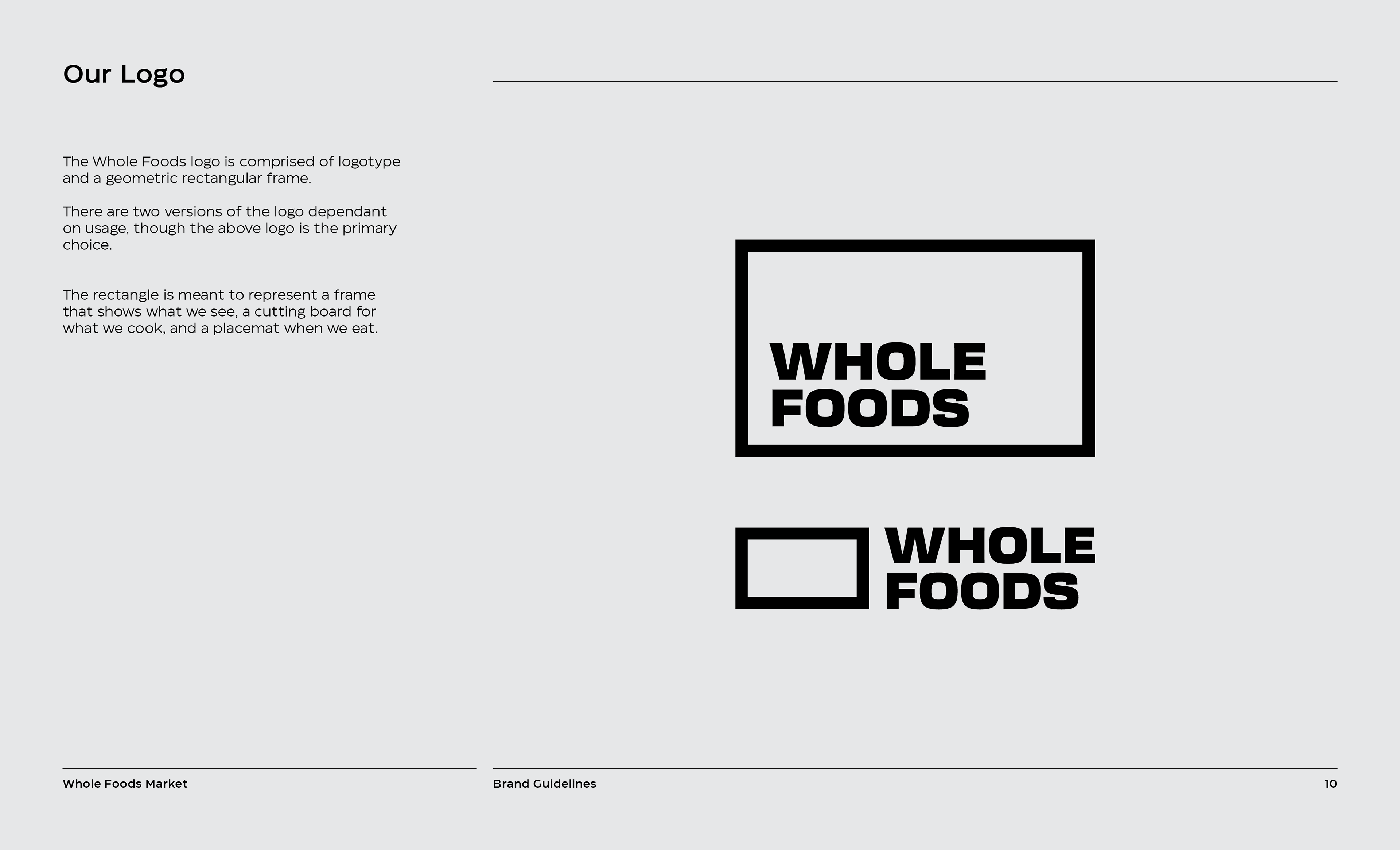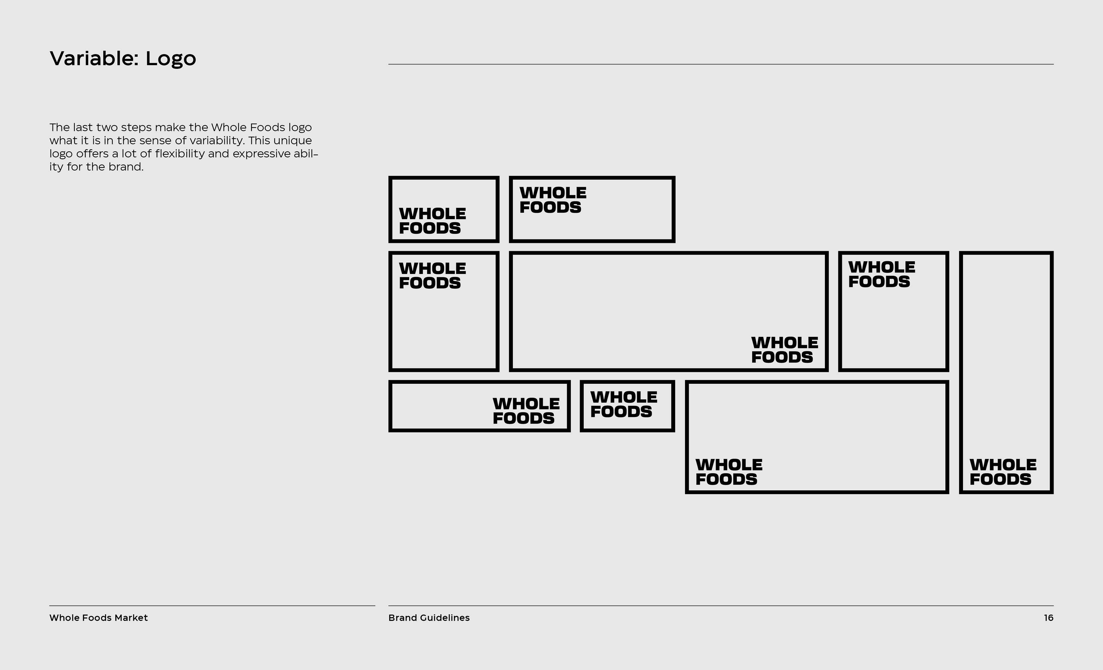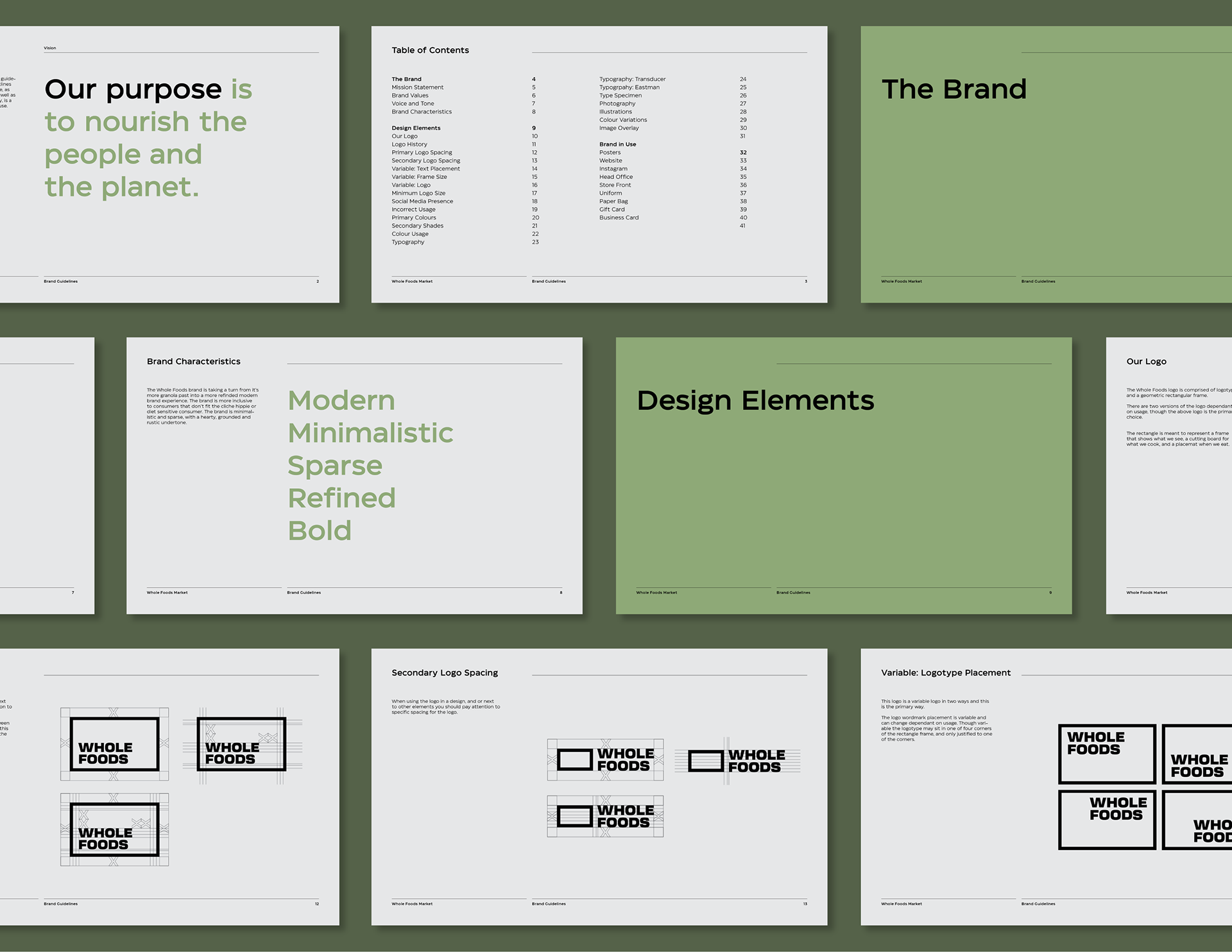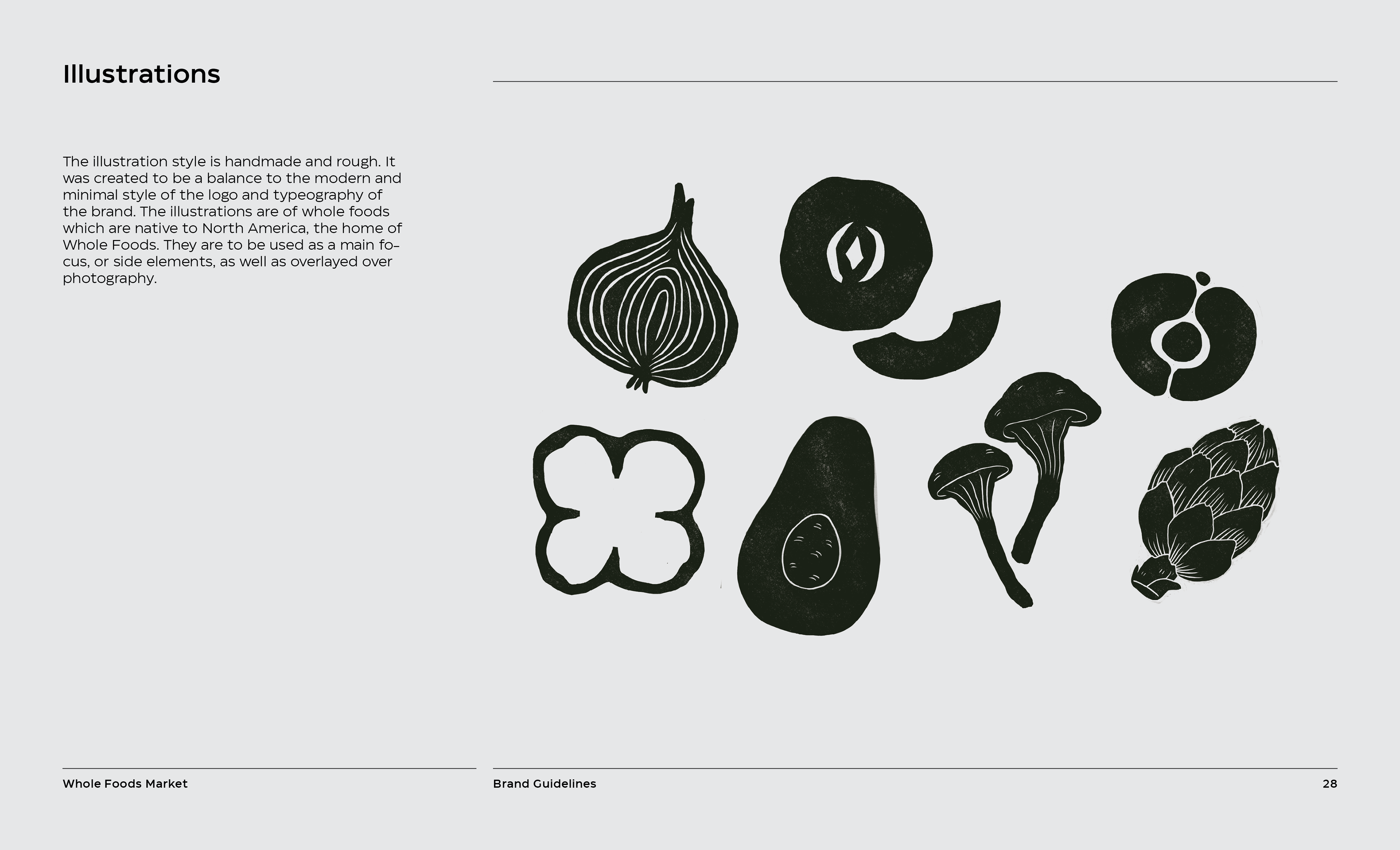 It is a rebranding of Whole Foods with a more contemporary, modern style. A new logo contains a variable system that now sets it apart with the ability to change, fill space, or frame elements. The frame element is meant to represent living through Whole Foods’ frame of values and also how it can change to fit your own values, as well as an abstract view of a shopping basket or cart from above. This new logo contrasted with hand-done illustration keeping a hearty, grounded, and rustic undertone.