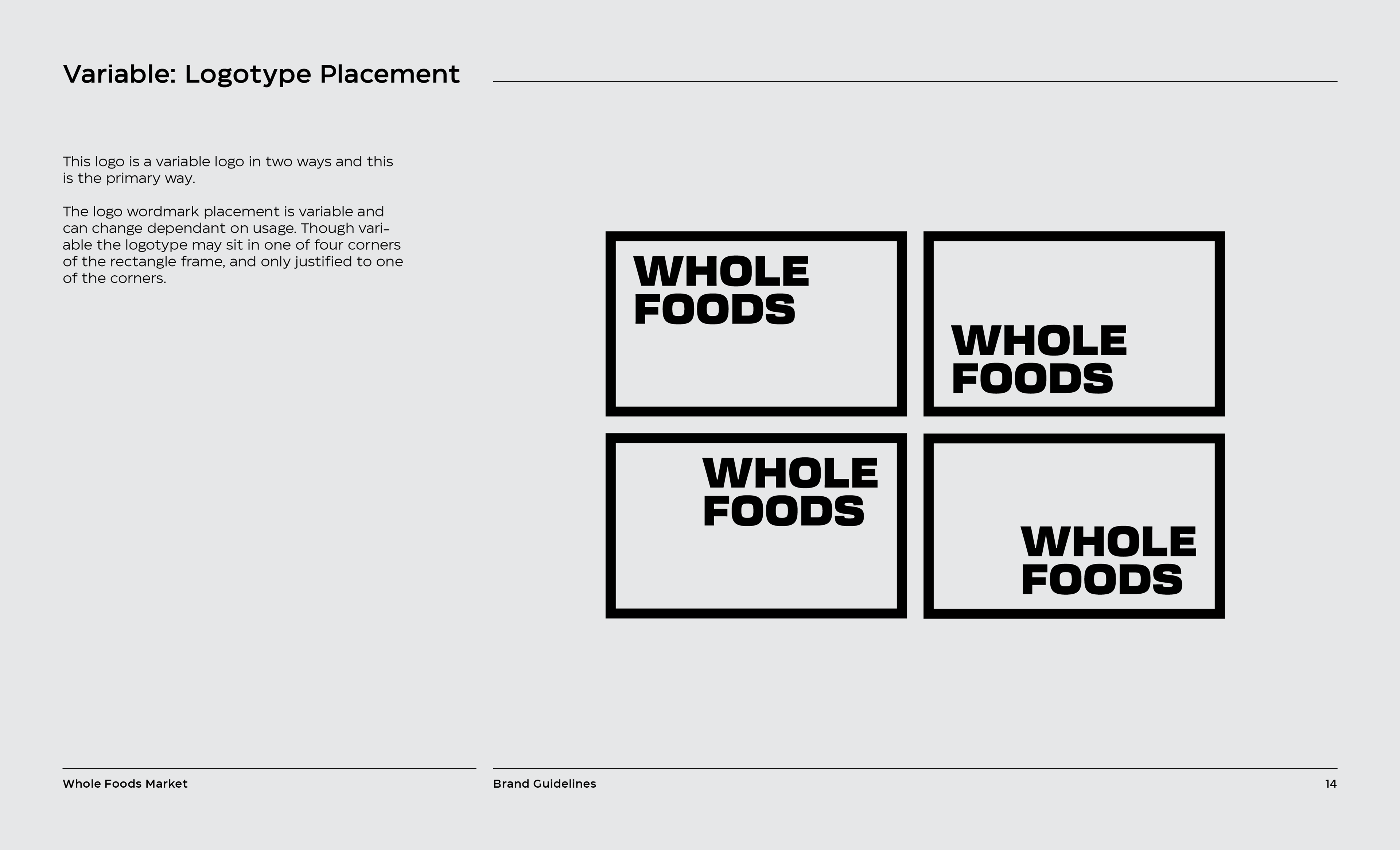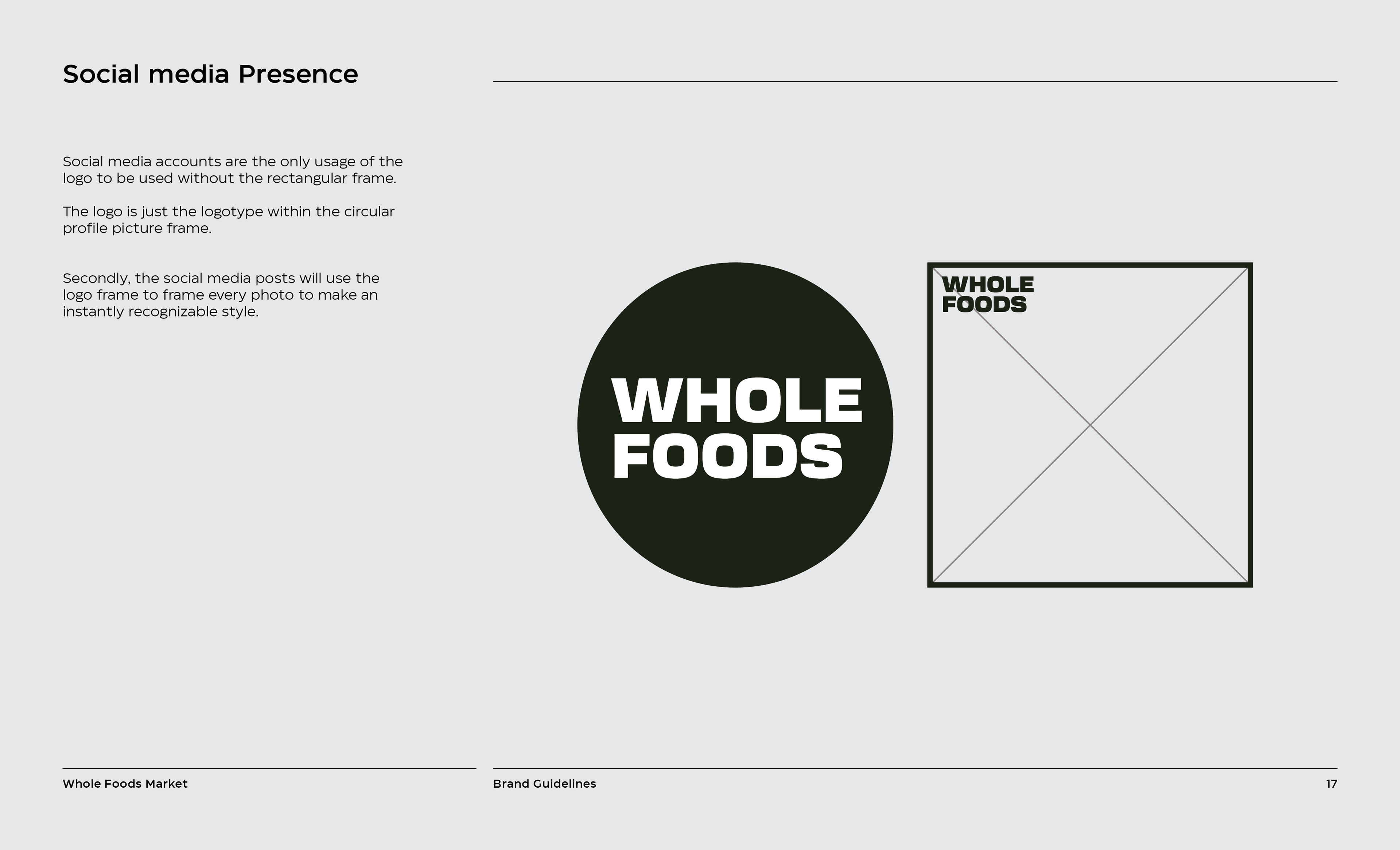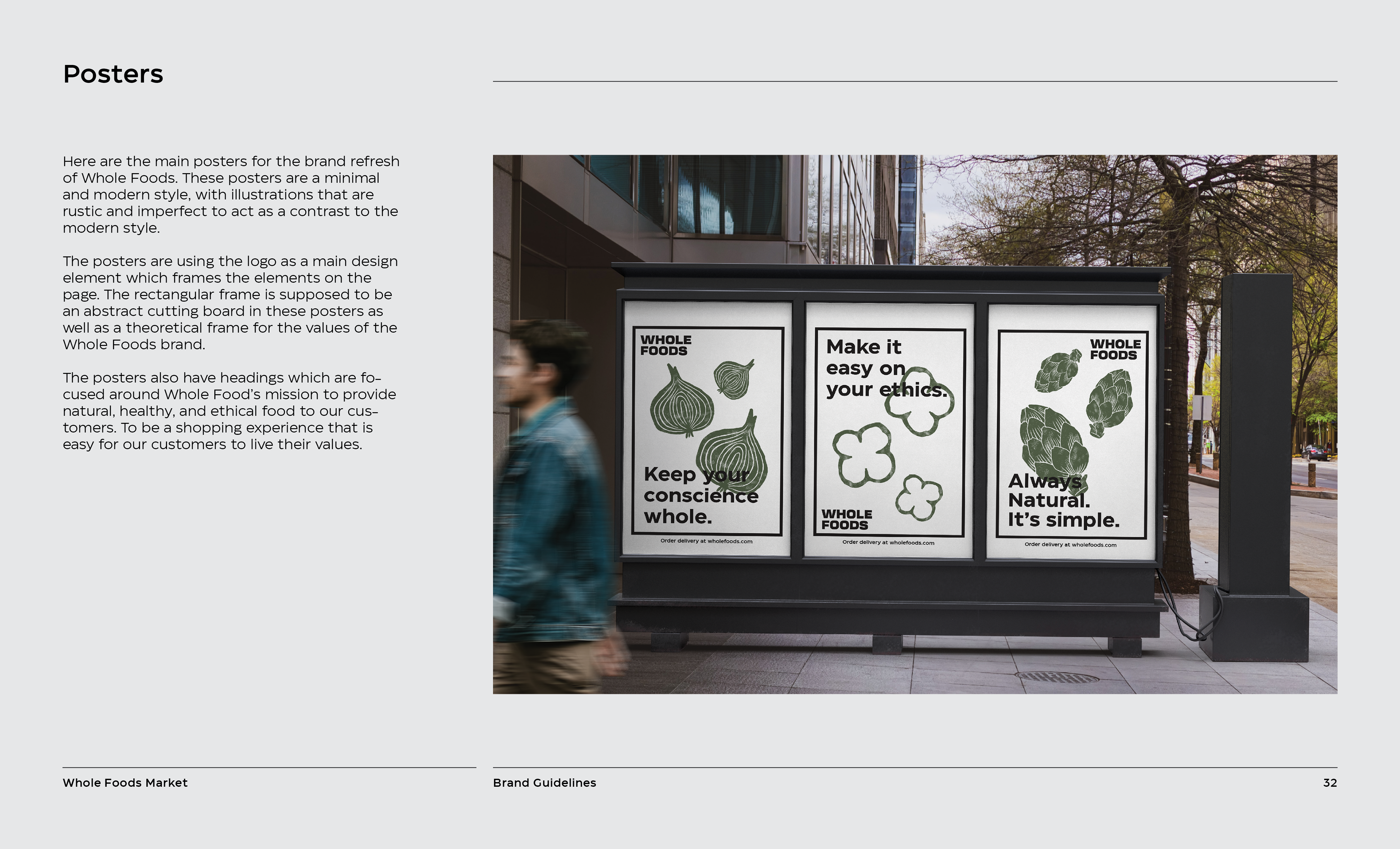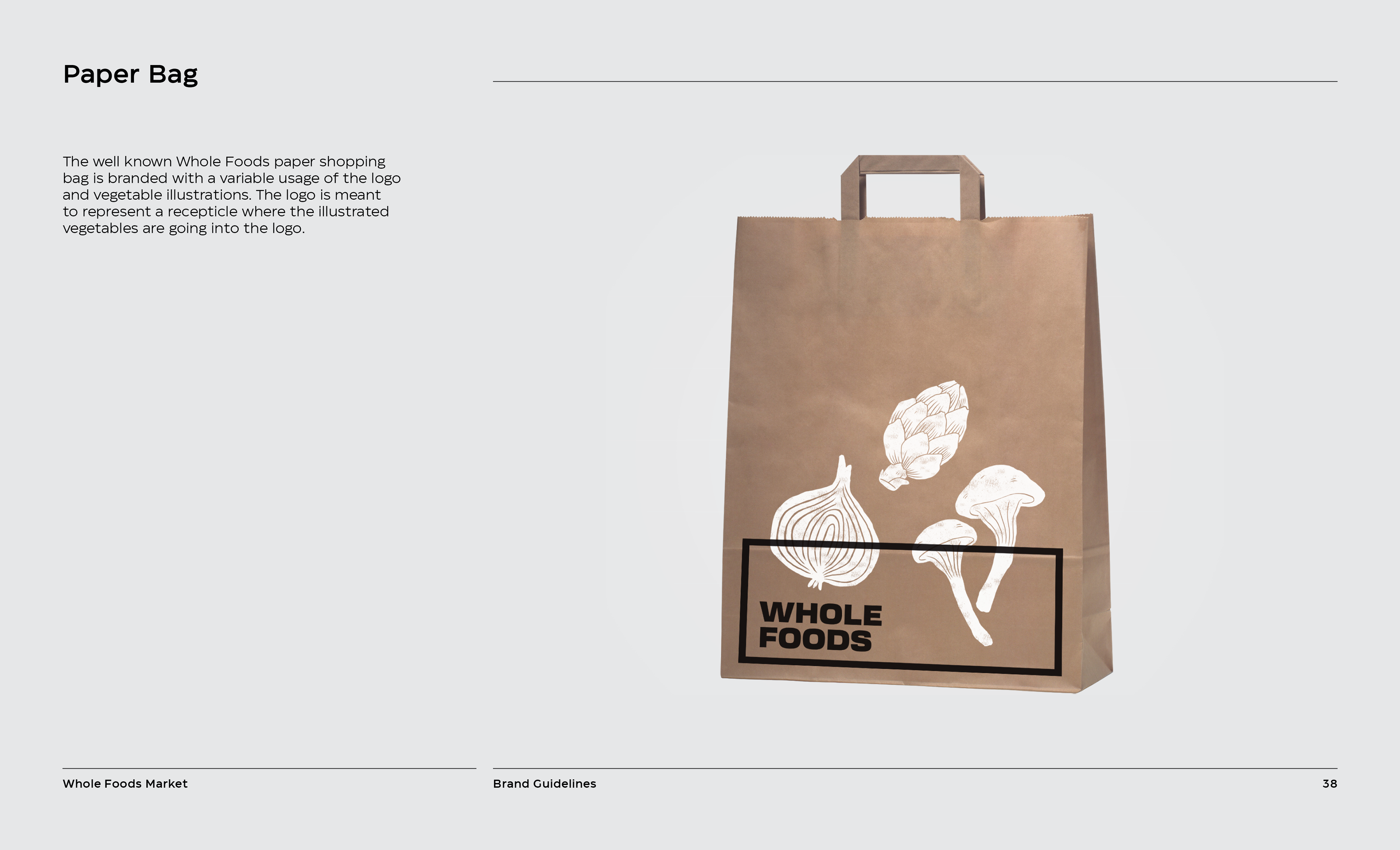 It is a rebranding of Whole Foods with a more contemporary, modern style. A new logo contains a variable system that now sets it apart with the ability to change, fill space, or frame elements. The frame element is meant to represent living through Whole Foods’ frame of values and also how it can change to fit your own values, as well as an abstract view of a shopping basket or cart from above. This new logo contrasted with hand-done illustration keeping a hearty, grounded, and rustic undertone.