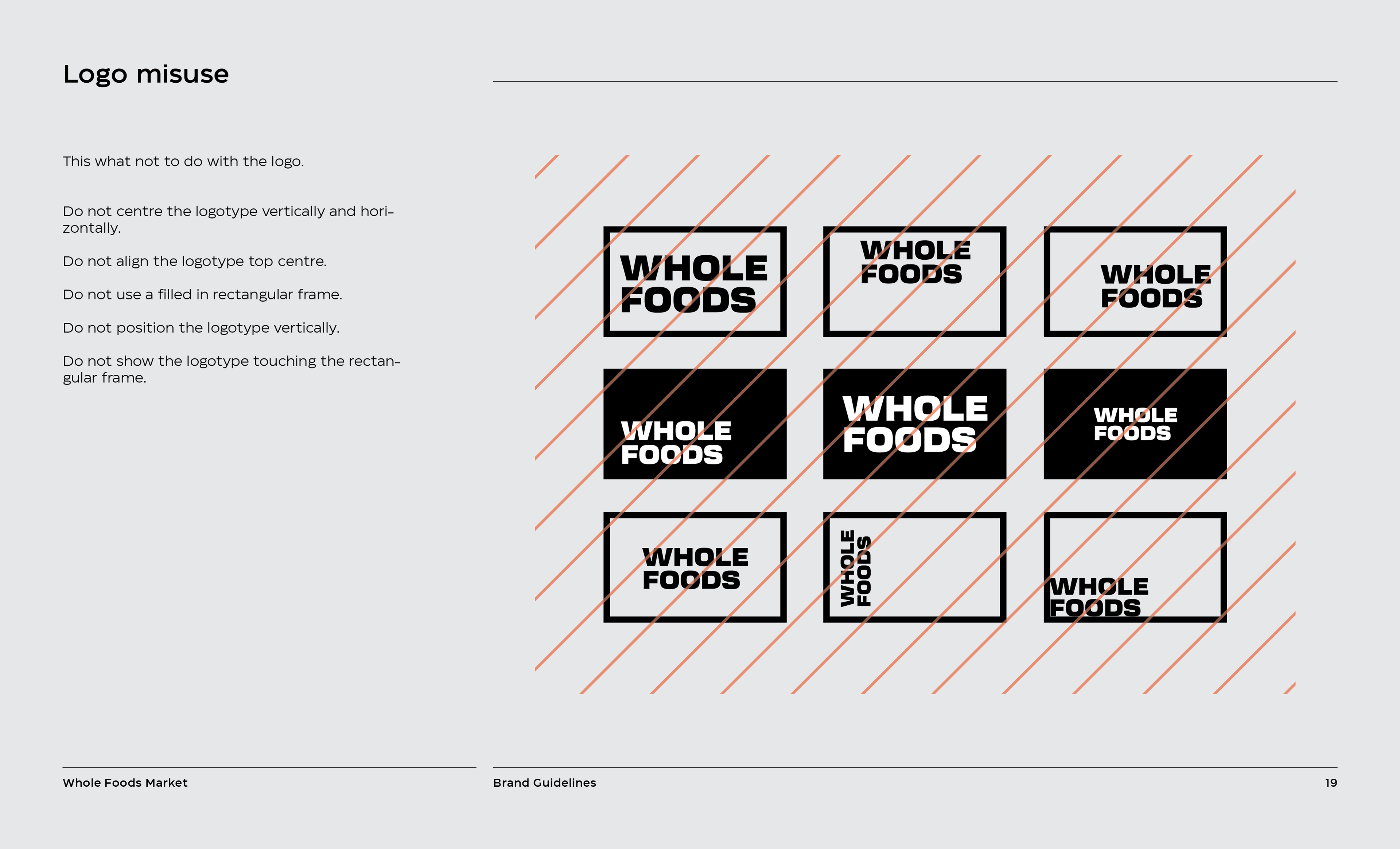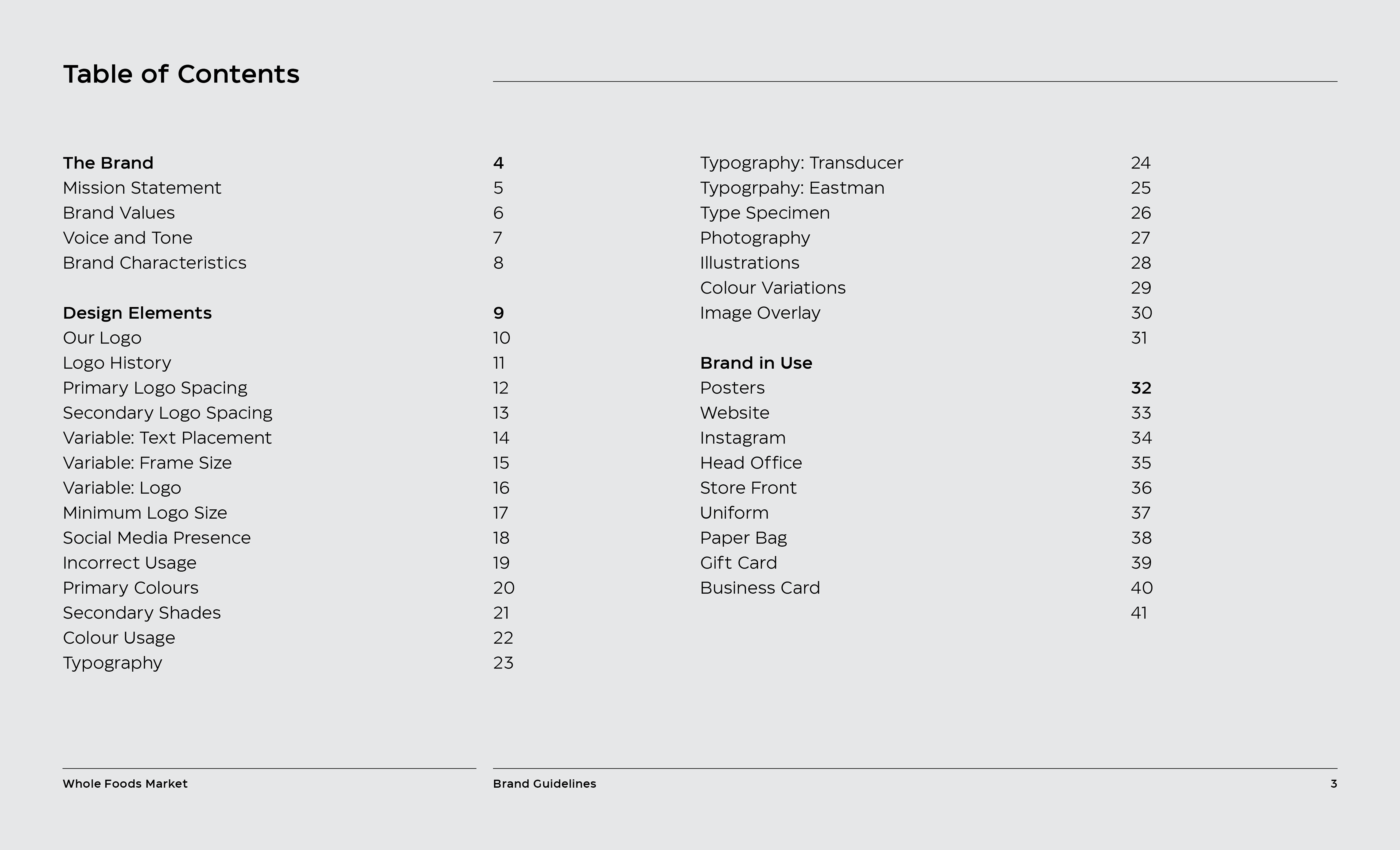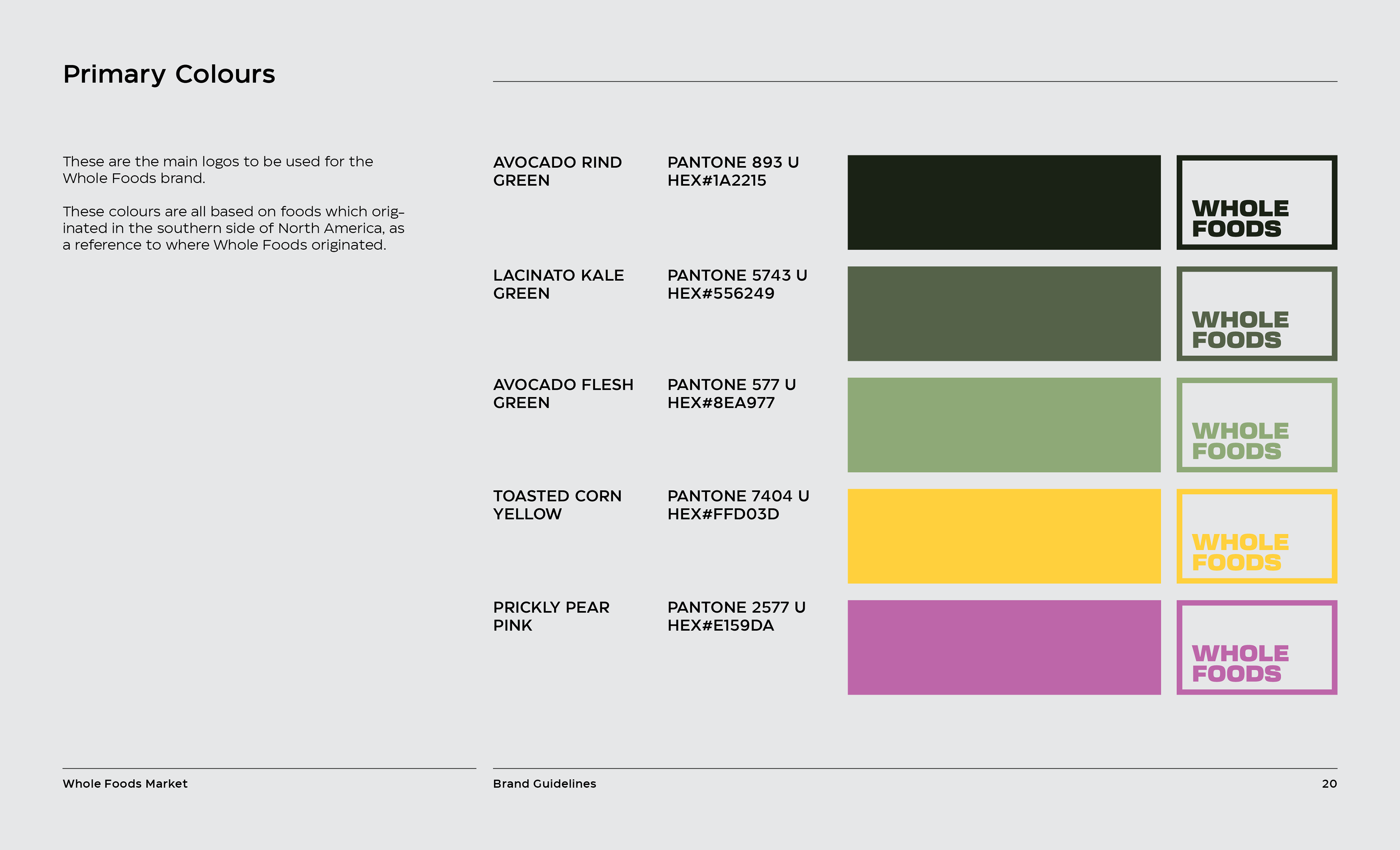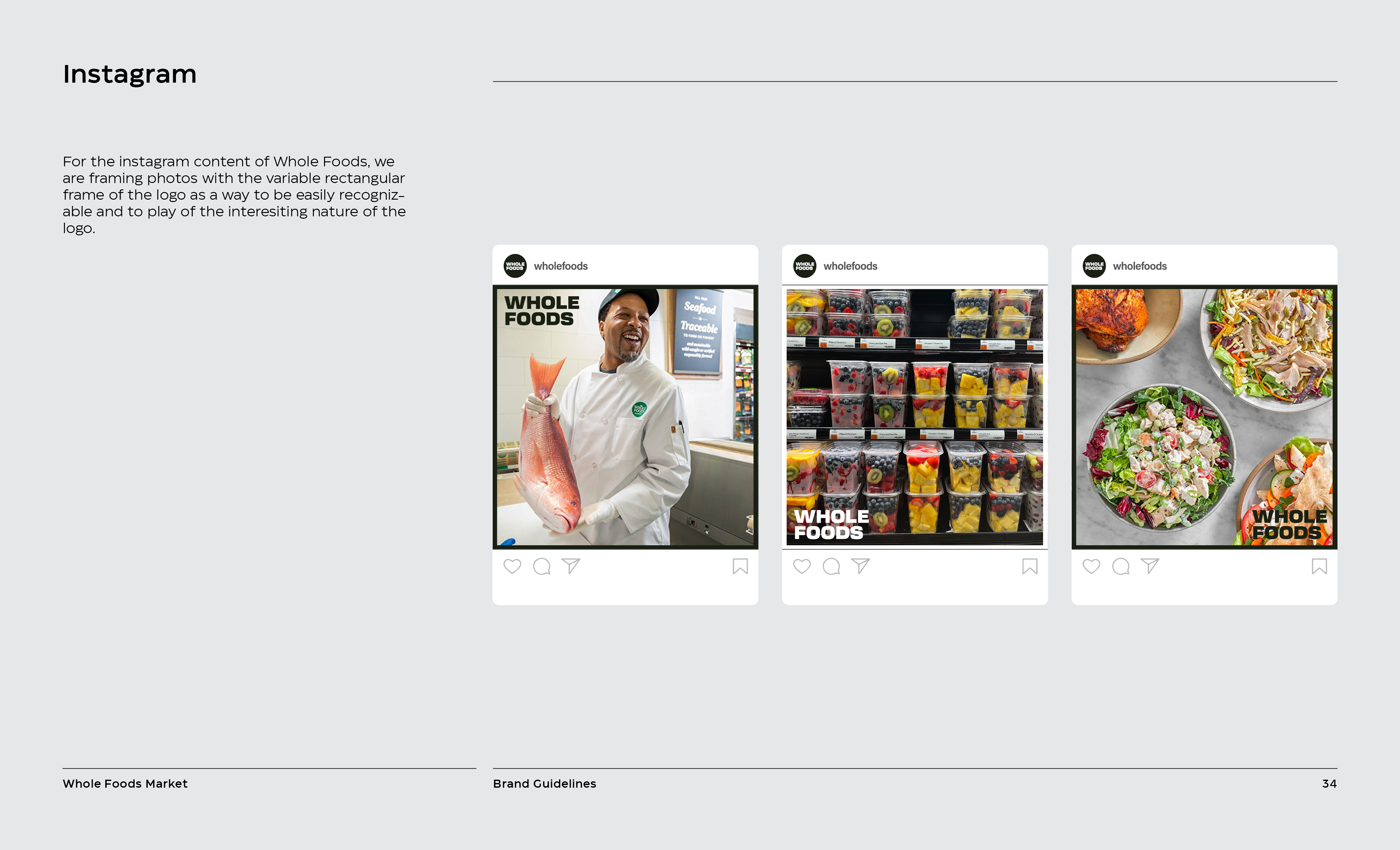 It is a rebranding of Whole Foods with a more contemporary, modern style. A new logo contains a variable system that now sets it apart with the ability to change, fill space, or frame elements. The frame element is meant to represent living through Whole Foods’ frame of values and also how it can change to fit your own values, as well as an abstract view of a shopping basket or cart from above. This new logo contrasted with hand-done illustration keeping a hearty, grounded, and rustic undertone.