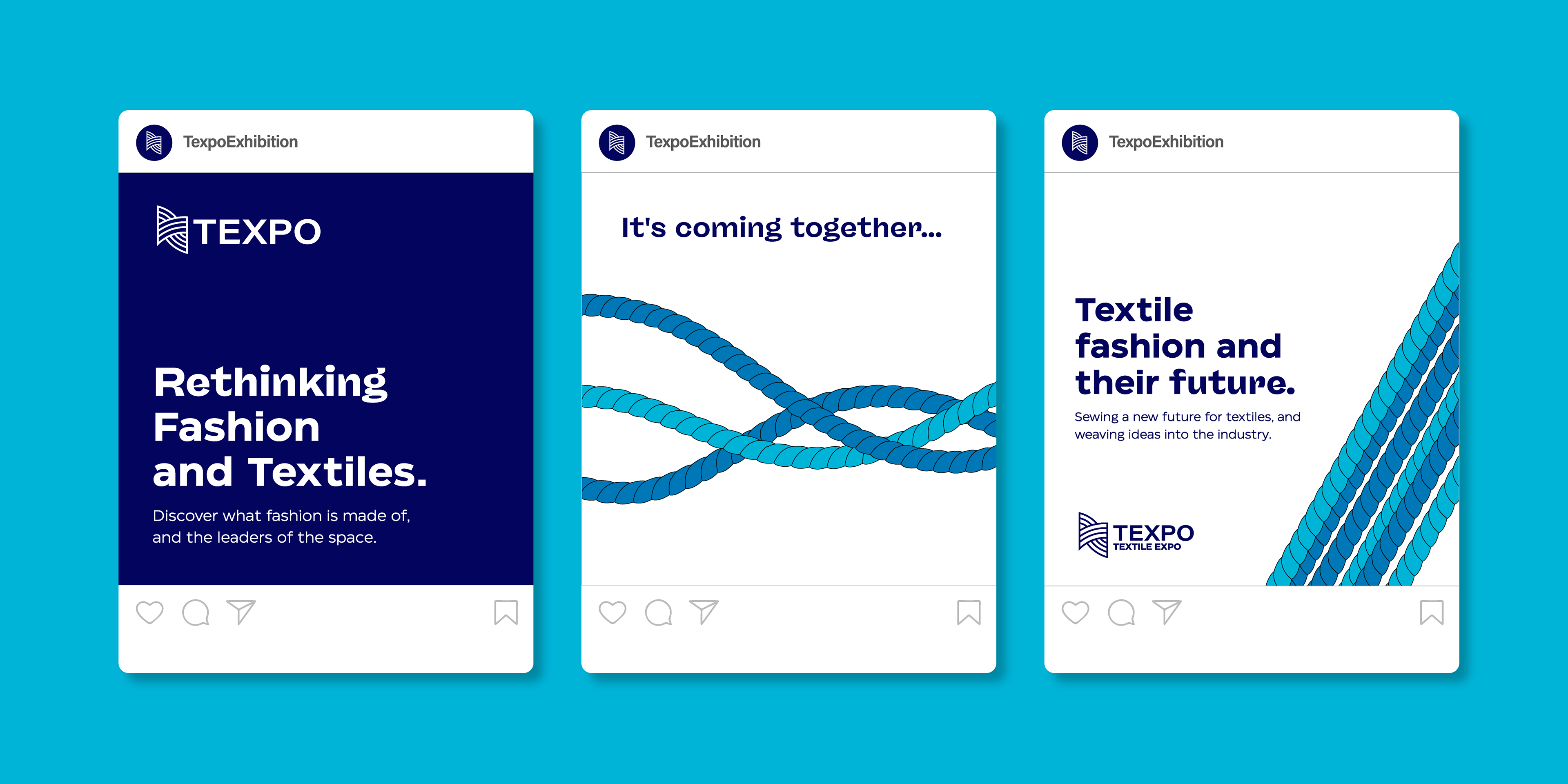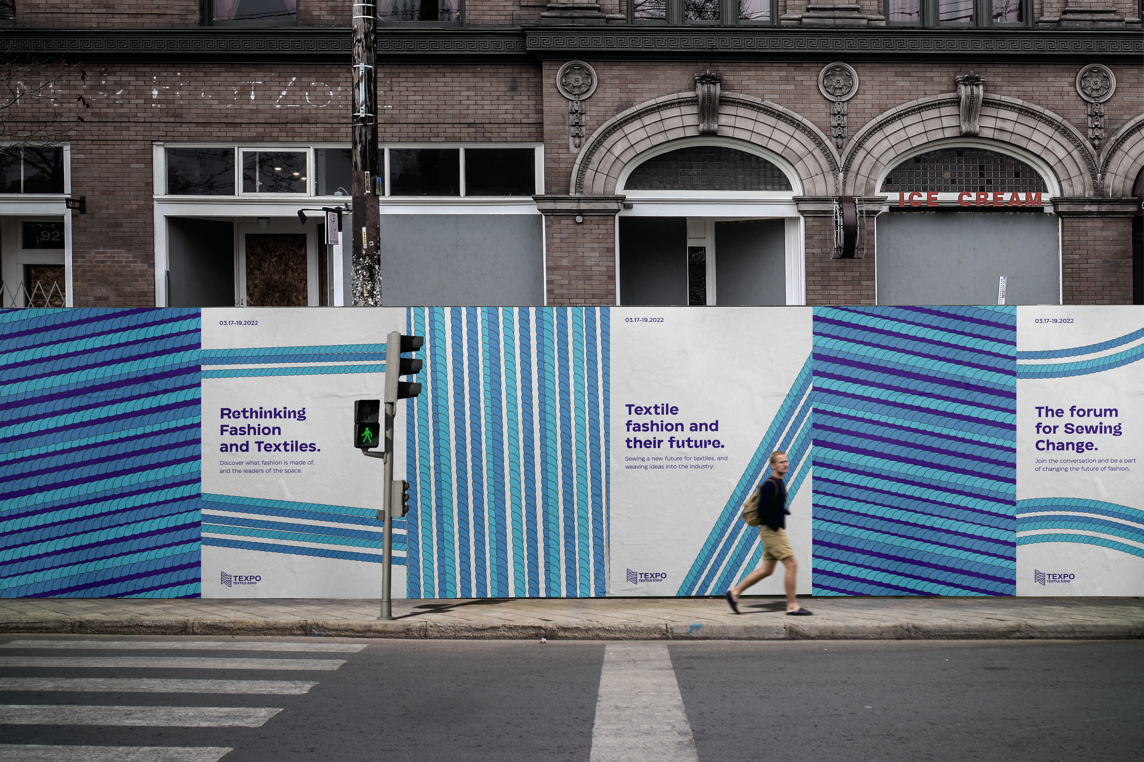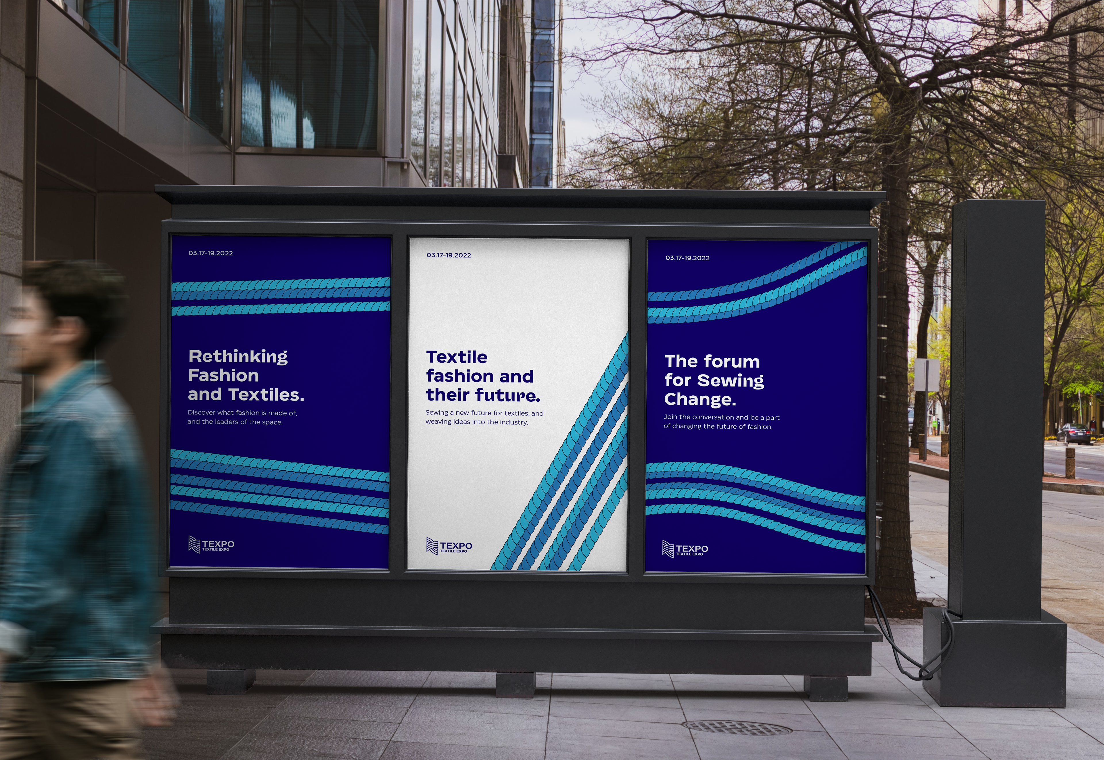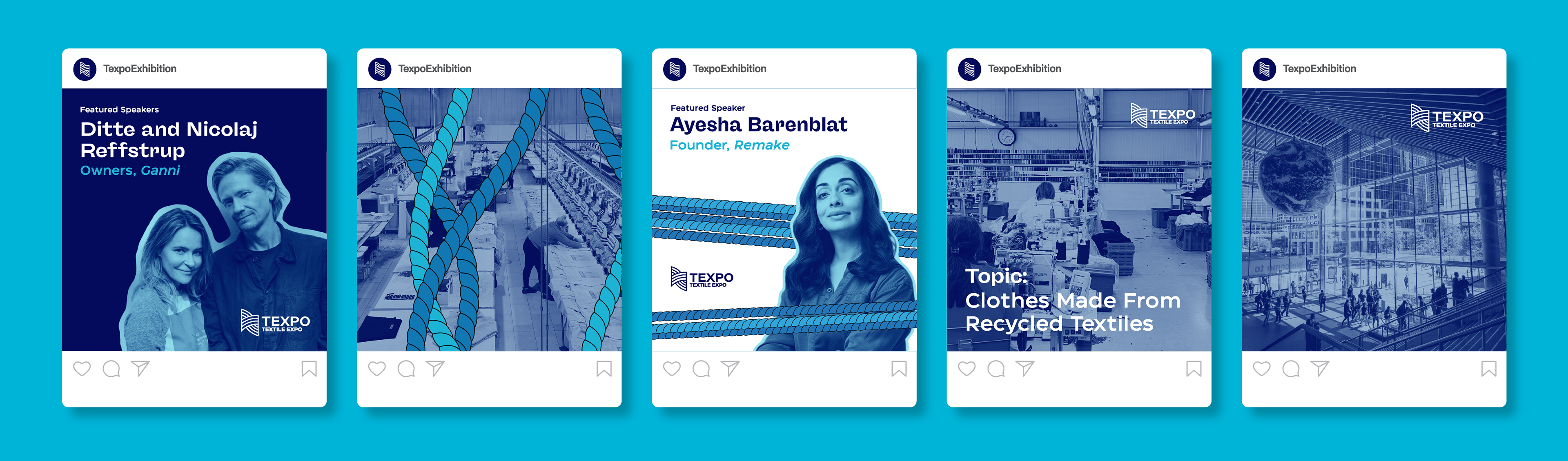 The direction of Texpo is a simple and graphic style meant to act as a backdrop to the conference with a cohesive identity. The brand’s colour is this main blue colour in multiple hues. The colour embodies the idea of recycling synthetics classically and recognisably. The main graphic is the thread element which represents both the fibres going into the textiles and clothing and the idea of coming together to weave the conversation surrounding textile waste and sustainability.