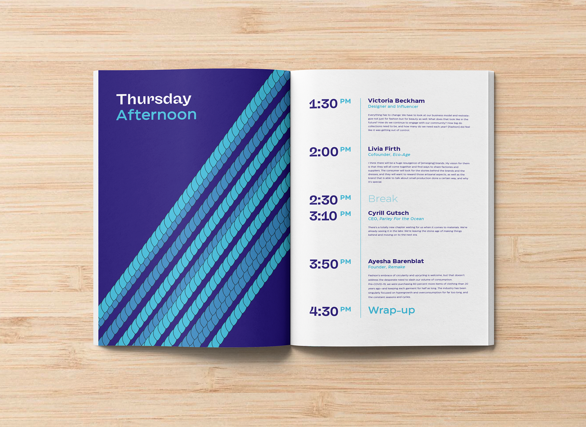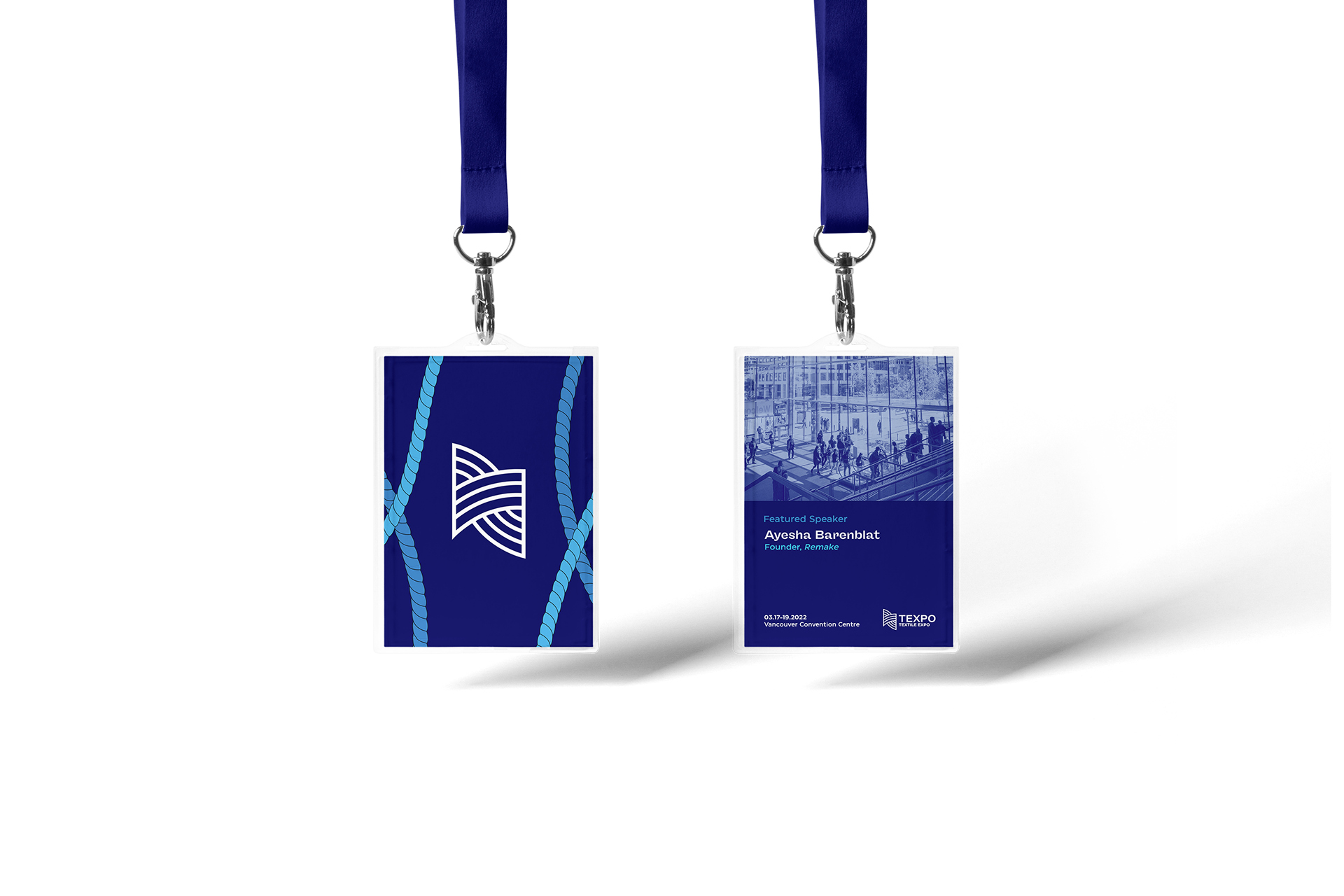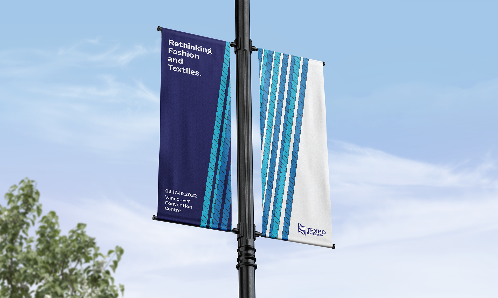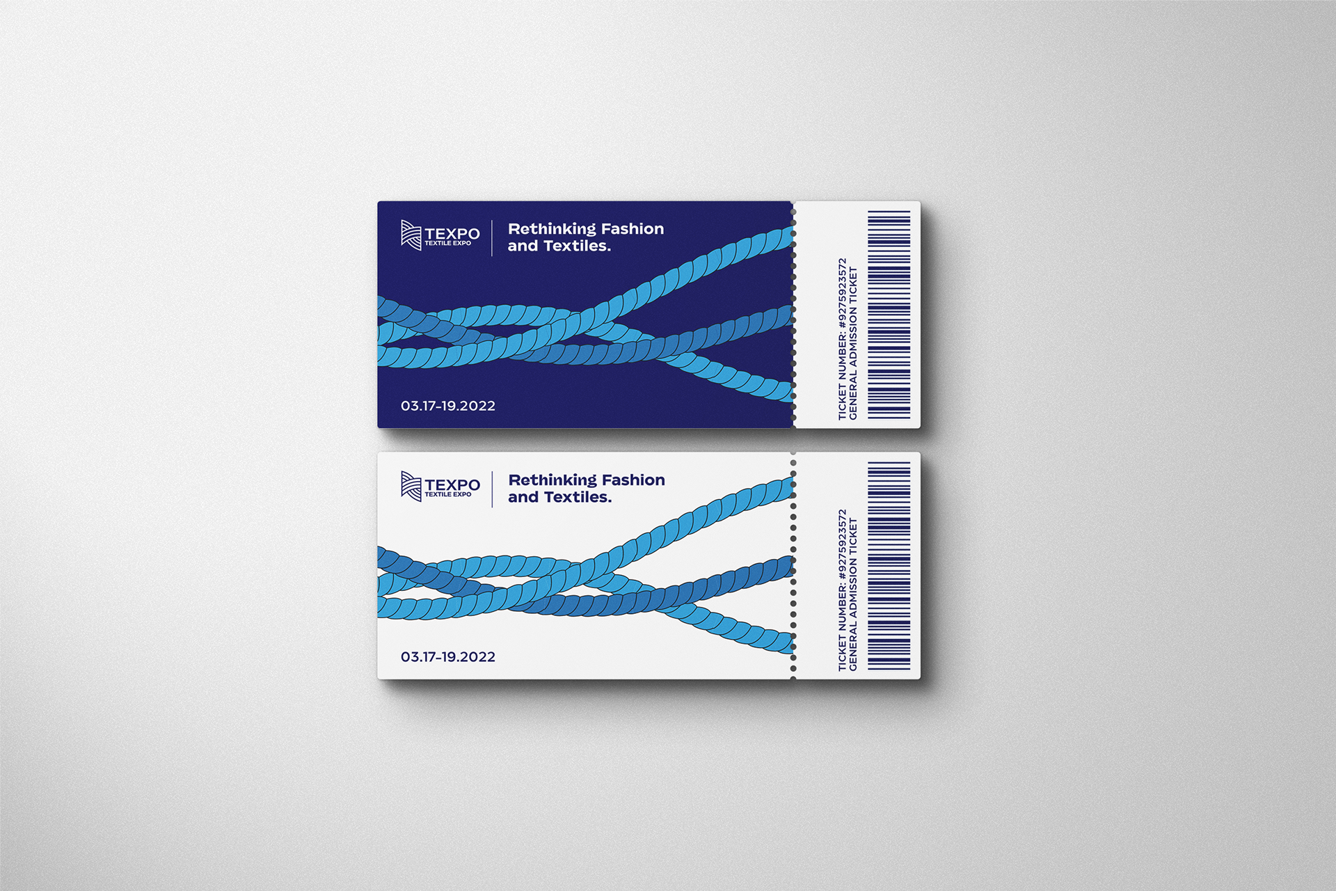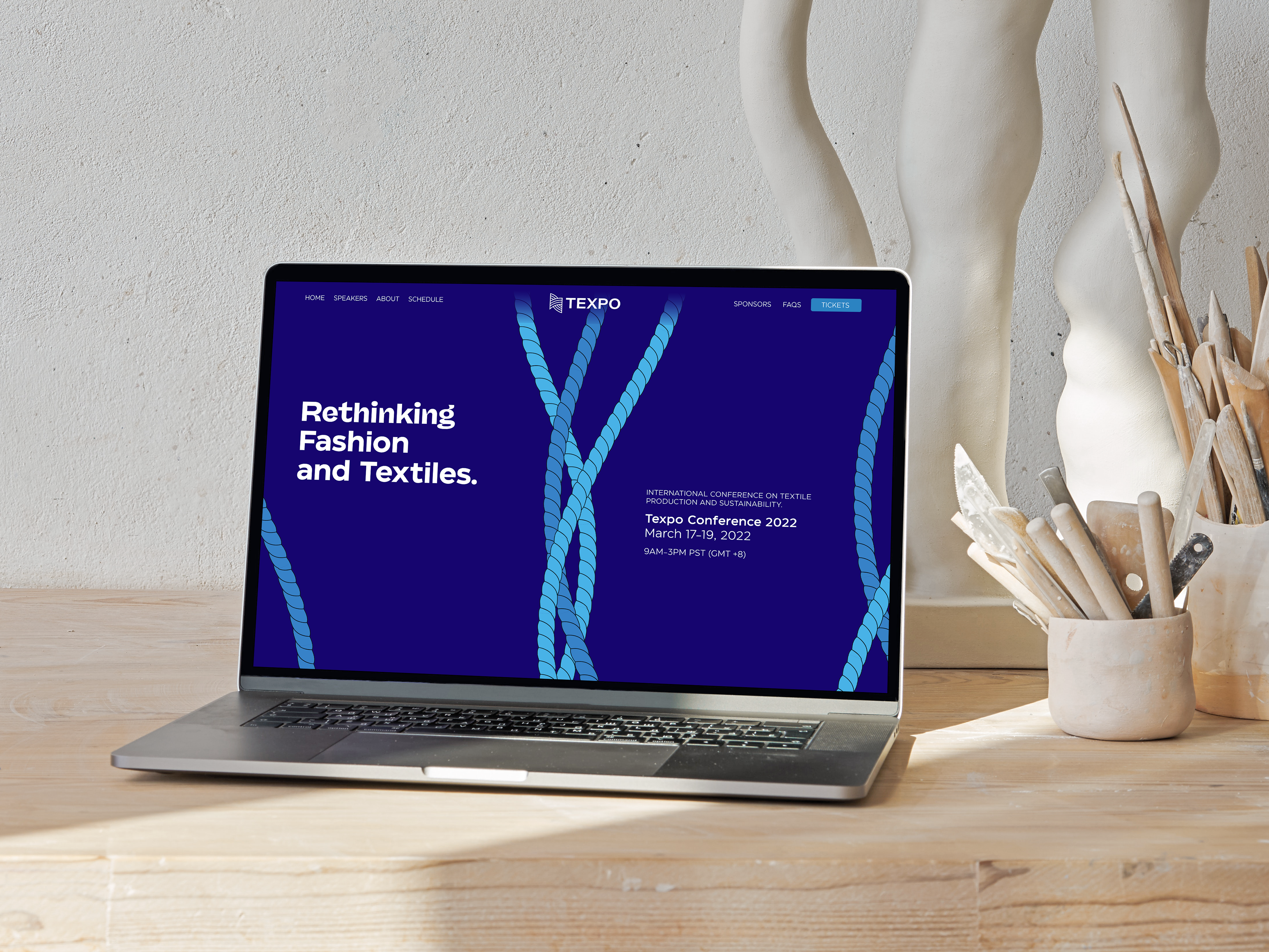 The direction of Texpo is a simple and graphic style meant to act as a backdrop to the conference with a cohesive identity. The brand’s colour is this main blue colour in multiple hues. The colour embodies the idea of recycling synthetics classically and recognisably. The main graphic is the thread element which represents both the fibres going into the textiles and clothing and the idea of coming together to weave the conversation surrounding textile waste and sustainability.